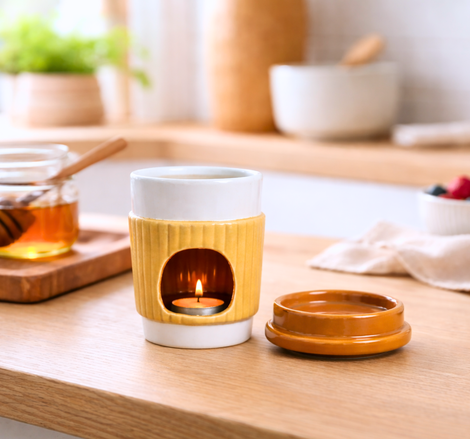 Avec ses tons doux et chaleureux et ses finitions textures, il évoque les moments cocooning autour d'un bon café. À la fois décoratif et fonctionnel, il diffuse délicatement vos fondants parfumés tout en créant une ambiance réconfortante et apaisante.