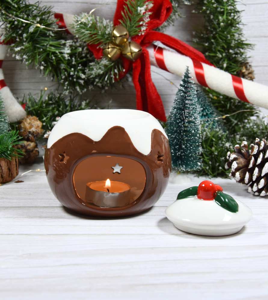 Faites souffler un vent de douceur et de gourmandise dans votre intérieur avec ce brûleur en forme de pudding de Noël. Inspiré du célèbre dessert des fêtes, il séduit par son design original et chaleureux : un corps couleur chocolat nappé d’un glaçage blanc effet neige, et un couvercle décoré d’un petit houx brillant. Fabriqué en céramique, il s’intègre parfaitement à une décoration de Noël traditionnelle et ajoute une touche joyeuse à votre ambiance hivernale.