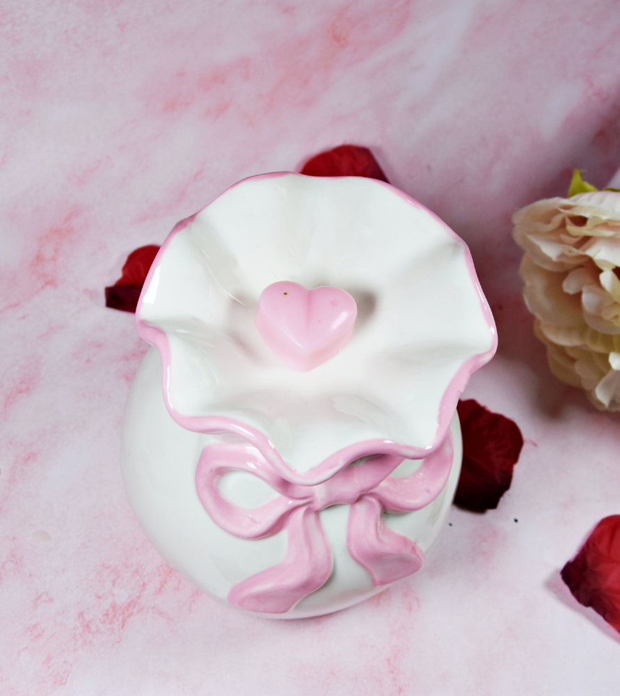 Apportez une touche de délicatesse à votre intérieur avec ce brûle-parfum Ruban rose en céramique blanche. Son design raffiné et romantique évoque l'univers du boudoir, de la douceur et du cocooning. Les lignes ondulées du col ajoutent une note élégante, faisant de ce brûleur un véritable objet décoratif.