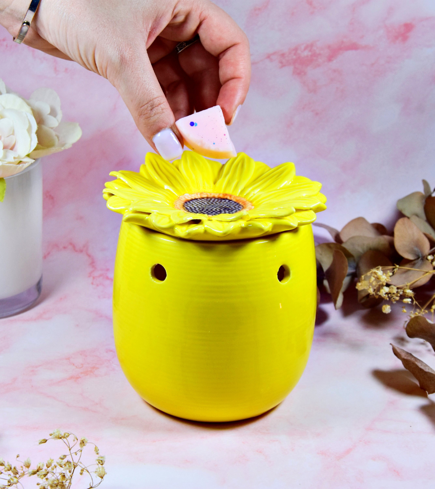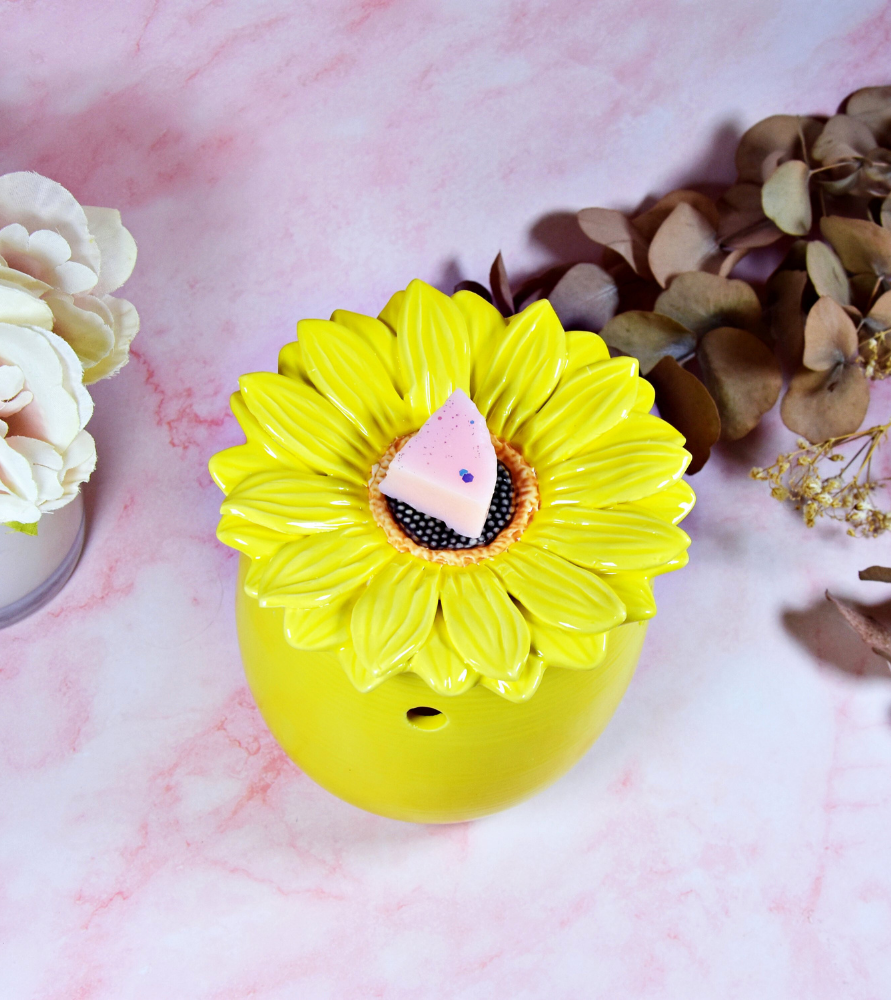 Le brûle-parfum "Tournesol" apporte chaleur et vitalité à votre intérieur grâce à son design soigné et solaire. Sa coupelle en céramique, délicatement façonnée en fleur de tournesol avec des pétales jaune vif entourant un coeur marron profond, évoque la joie et la luminosité de l'été.